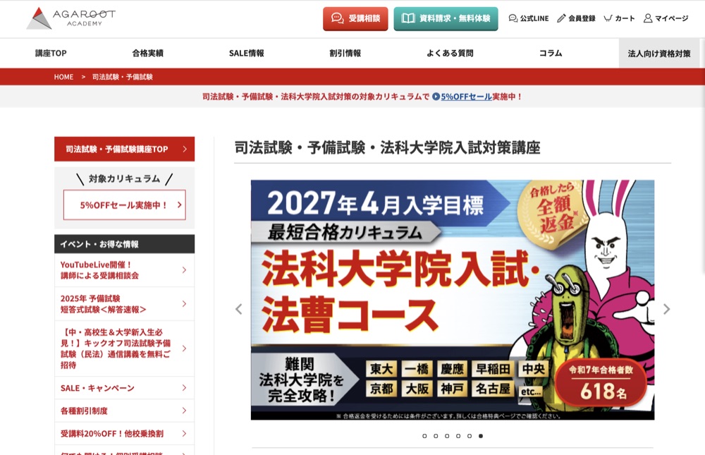 アガルートは令和7年司法試験合格者1,581名のうち618名(占有率39.1%)を輩出した実績を公式公表している予備校です。最大の特徴は予備試験合格時の全額返金制度。フルカリキュラム受講生が予備試験に合格した場合、受講料1,298,000円が全額返金される制度を採用しています。